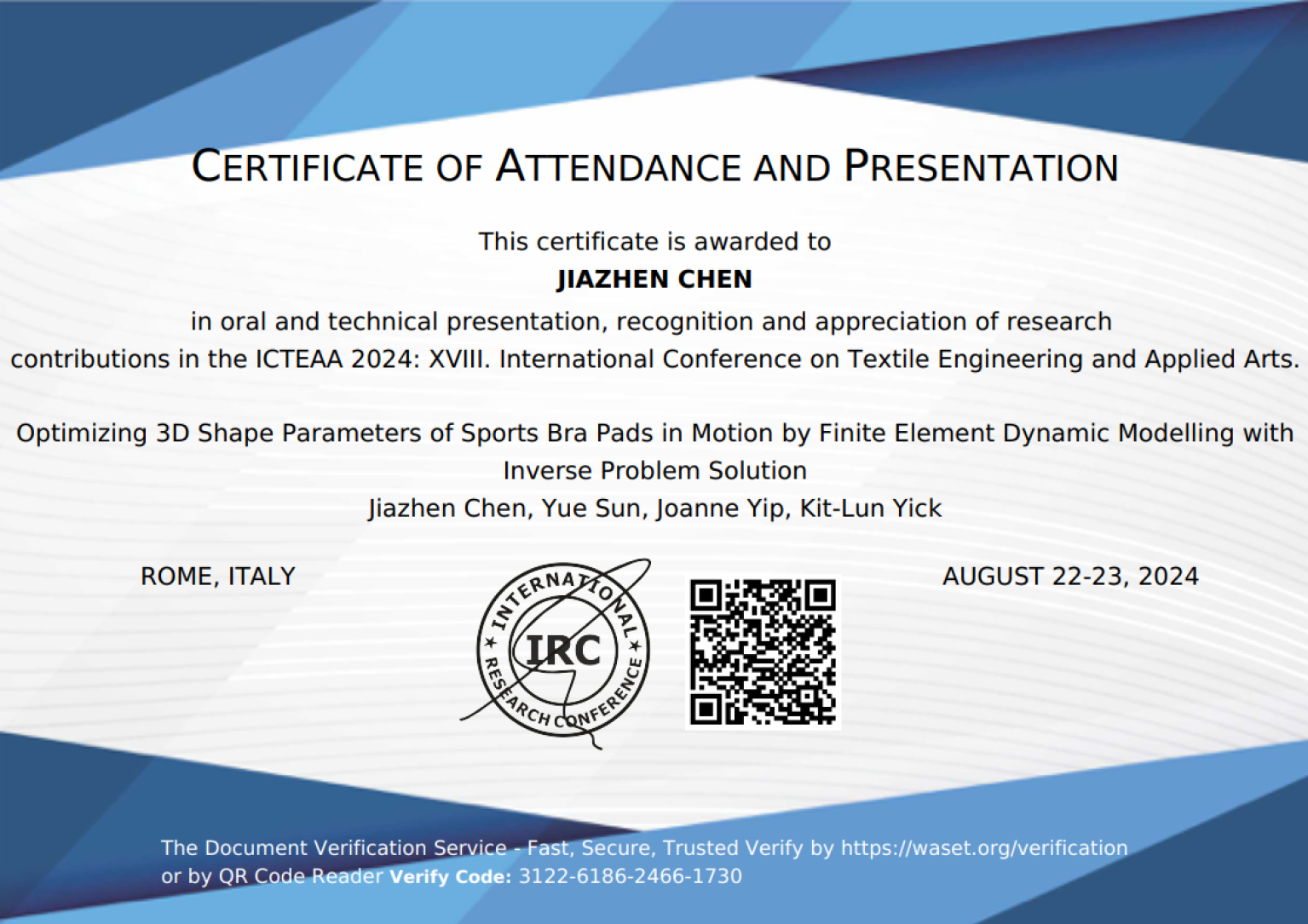 The team also earned a Certificate of Attendance and Presentation for their paper, “Optimizing 3D Shape Parameters of Sports Bra Pads in Motion by Finite Element Dynamic Modelling with Inverse Problem Solution,” led by Jiazhen Chen, Yue Sun, Joanne Yip, and Kit-Lun Yick. This research uses finite element dynamic modeling to enhance the design of sports bra pads, aiming to maintain shape and comfort during motion. The practical implications of this study are significant, as it advances the functionality and performance of sports bras, meeting the evolving needs of consumers.