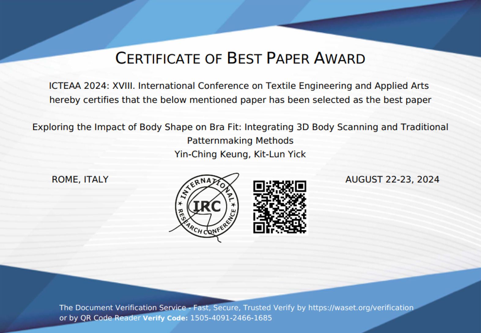 The team also earned a Certificate of Attendance and Presentation for their paper, “Optimizing 3D Shape Parameters of Sports Bra Pads in Motion by Finite Element Dynamic Modelling with Inverse Problem Solution,” led by Jiazhen Chen, Yue Sun, Joanne Yip, and Kit-Lun Yick. This research uses finite element dynamic modeling to enhance the design of sports bra pads, aiming to maintain shape and comfort during motion. The practical implications of this study are significant, as it advances the functionality and performance of sports bras, meeting the evolving needs of consumers.