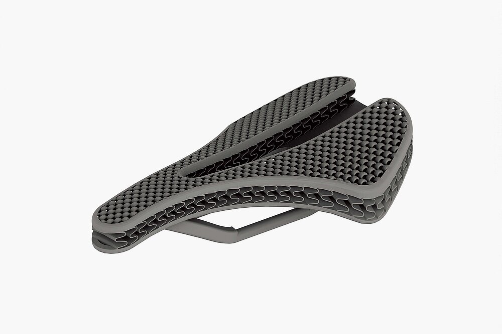 The AIR ONE SADDLE, produced through a single 3D printing process, integrates innovative structural designs for comfort and performance. It features a 3D-knitted looping structure for breathability, adjustable zigzag cushioning for weight relief, and continuous carbon fibre rails for strength. This unique design reduces saddle sores and accommodates customisation based on individual physiological characteristics, making it ideal for discerning cyclists.