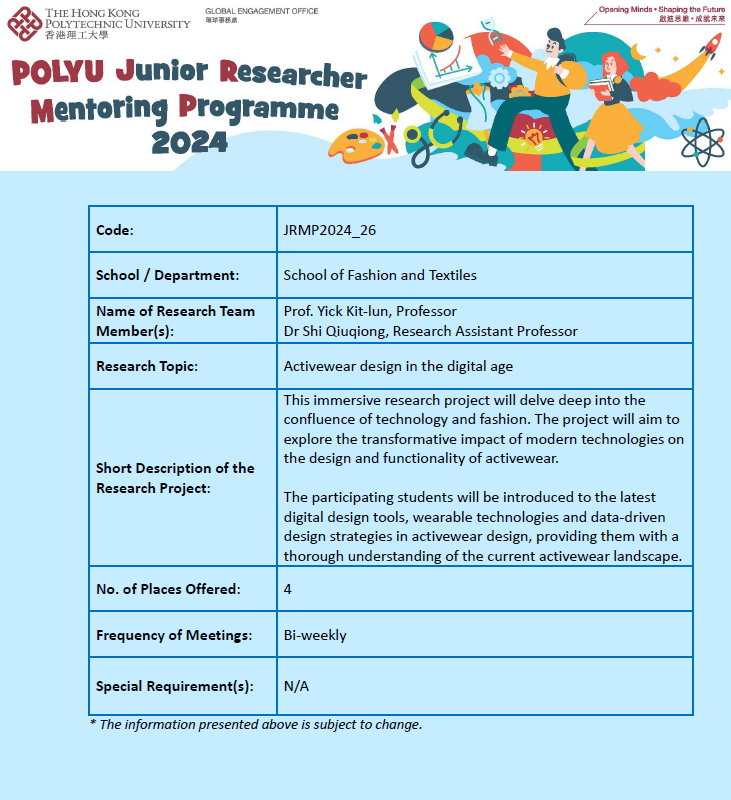 It aims to offer research experience to secondary school students. A total of 7 secondary school students joined this project and participated in different laboratory works on sports bras research. Students were introduced to the latest digital design tools and wearable technologies in activewear design, with a thorough understanding of the current activewear landscape.