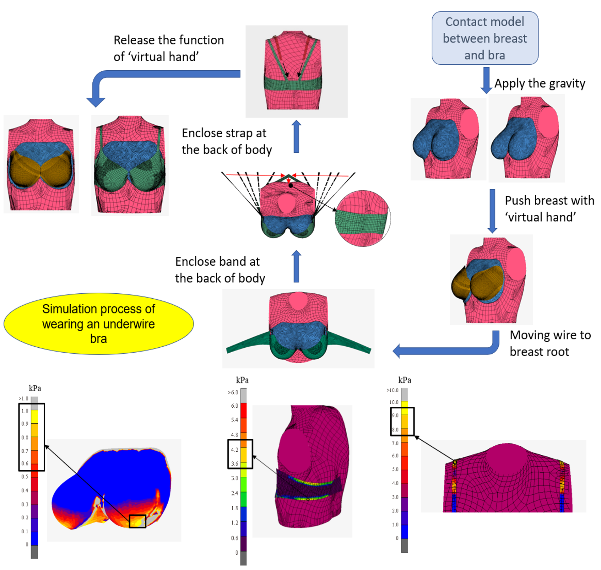 Women often wear ill-fitting bras which cause pain, discomfort and sagging due to the over-simplified bra-sizing system used in the manufacture of commercial bras. In addition, a long development process is required for conventional bra design from creating the prototype to manufacturing the final product, which include the key steps of material selection, pattern making and grading. Thus, in order to reduce the time of the product development cycle and assist bra designers in determining individual bra fit that provides an optimal supportive shape and comfortable pressure, numerical simulation is a potential new tool. The objective of this study is to comprehensively provide information to bra designers so that they gain a better understanding of the interaction process between the breasts and bras with different design features by using numerical simulation. In order to achieve this objective, a study that involves three main stages is conducted: determining the realistic material coefficients of breast tissues to be used for building an accurate biomechanical FE model; developing a subject-specific FE model to simulate the wear process of a bra; and providing a parametric design for different bra features to evaluate the shaping effects of the breasts and pressure distribution on the body.