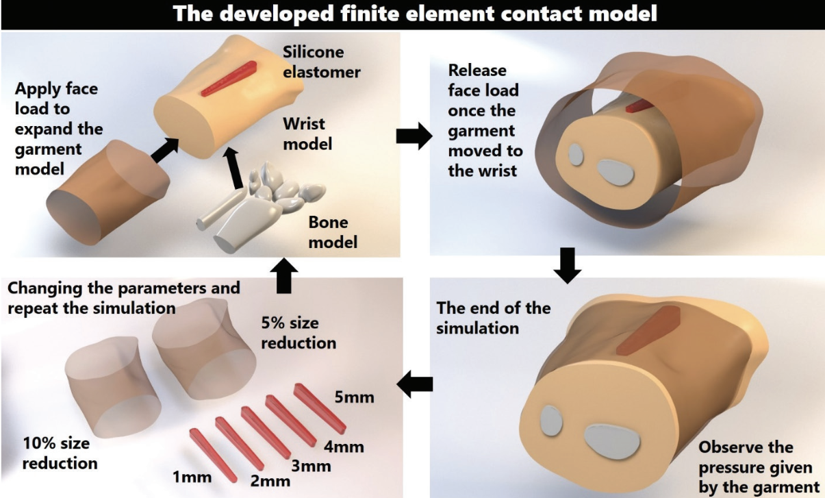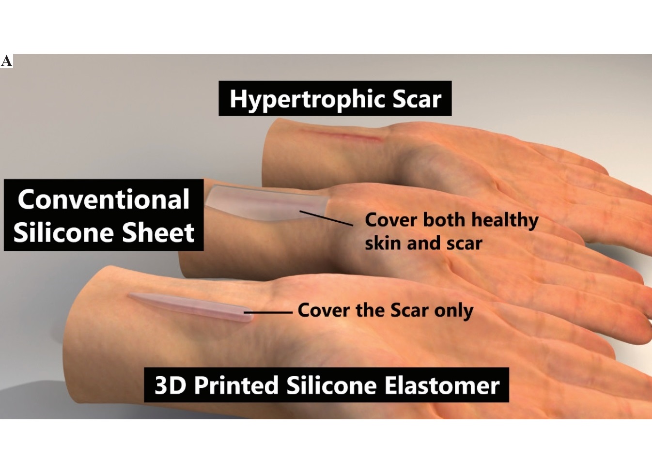 The treatment of hypertrophic scars (HSs) is considered to be the most challenging task in wound rehabilitation. Conventional silicone sheet therapy has a positive effect on the healing process of HSs. However, the dimensions of the silicone sheet are typically larger than those of the HS itself which may negatively impact the healthy skin that surrounds the HS. Furthermore, the debonding and displacement of the silicone sheet from the skin are critical problems that affect treatment compliance. Herein, we propose a bespoke HS treatment design that integrates pressure sleeve with a silicone sheet and use of silicone gel using a workflow of three-dimensional (3D) printing, 3D scanning and computer-aided design, and manufacturing software. A finite element analysis (FEA) is used to optimize the control of the pressure distribution and investigate the effects of the silicone elastomer. The result shows that the silicone elastomer increases the amount of exerted pressure on the HS and minimizes unnecessary pressure to other parts of the wrist. Based on this treatment design, a silicone elastomer that perfectly conforms to an HS is printed and attached onto a customized pressure sleeve. Most importantly, unlimited scar treating gel can be applied as the means to optimize treatment of HSs while the silicone sheet is firmly affixed and secured by the pressure sleeve.