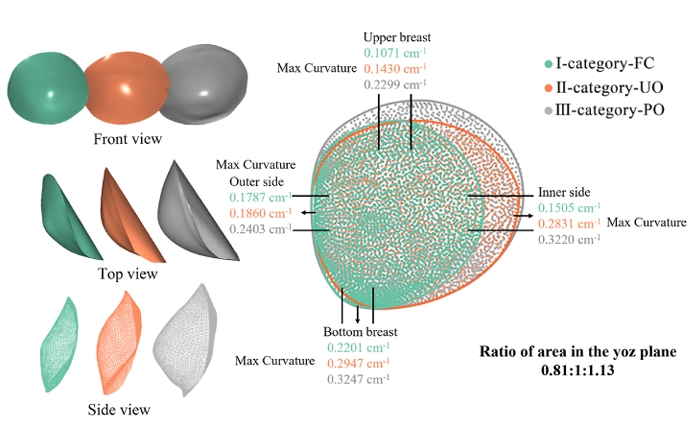 In order to analyze the breast shapes and provide basis for the development of bra sizing system and garment pattern-making, this study proposed a method to classify breast shapes from breast local features and overall shape based on the detailed breast morphological parameters. A definition for the breast boundary was deter mined to establish a measuring standard for the feature points, and then 18 related parameters were obtained based on the 3D point-cloud data of 158 unmarried young female college students aged between 18 and 25. Six shape parameters were selected for cluster analysis. In addition, the gathering ratio was induced to classify the breast shapes of subjects into nine categories that are FC-Middle, FC-Gathering, FC-Separating, UO-Middle, UO- Gathering, UO-Separating, PO-Middle, PO-Gathering and PO-Separating. Through verification, it shows that the error range of 95.71% UBP and 91.43% OBP are all less than 1.5 cm, while the error range of 81.43% UBP and 74.29% OBP are less than 1 cm. The accuracy of the classified results via the proposed method is 97.33%. The classification of breast shapes of this study can provide a reference for young women to choose the correct size of bra.