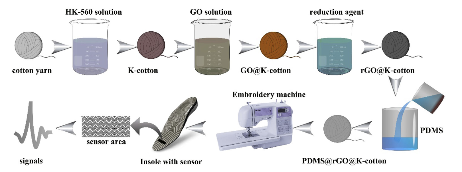 A foot pressure sensor was fabricated by using Polydimethylsiloxane (PDMS) coated conductive cotton yarn via embroidery technique. Cotton yarn was firstly modified with a silane coupling agent and coated with rGO to form a conductive core yarn, following by a coating of PDMS sheath layer. The fabricated yarn electrode was then sewing into different fabrics to assemble pressure sensors by using the embroidery technique. The preparation process was characterized by using scanning electron microscopy and Fourier Transform Infrared spectroscopy. The performance of single yarn electrodes and assembled devices were tested by collecting the signal of short-circuit current with varying frequencies and applied forces. The results indicate that the prepared foot pressure sensor can be successfully applied to practical applications of monitoring human body basic movement.