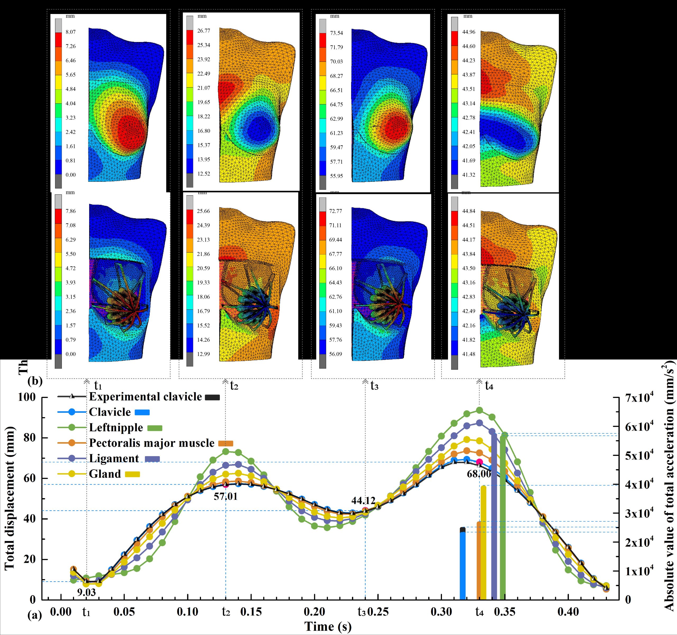 This study aims to investigate the biomechanical behaviour and the stiffness impact of the breast internal components during running. To achieve this, a novel nonlinear multi-component dynamic finite element method (FEM) has been established, which uses experimental data obtained via 4D scanning technology and a motion capture system. The data are used to construct a geometric model that comprises the rigid body, layers of soft tissues, skin, pectoralis major muscle, fat, ligaments and glandular tissues. A biomechanical analysis indicates that the stress sustained by the breast components in ascending order is the glandular tissues, pectoralis major muscle, adipose tissues, and ligaments. The ligaments provide the primary support during motion, followed by the pectoralis major muscle.