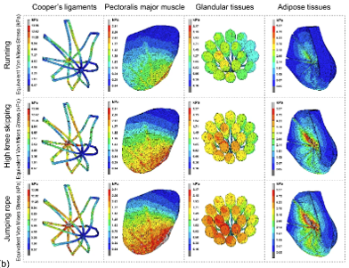 This study presents an advanced dynamic finite element (FE) model of multiple components of the breast to examine the biomechanical impact of different types of physical activities and activity intensity on the breast tissues. Using 4D scanning and motion capture technologies, dynamic data are collected during different activities. The accuracy of the FE model is verified based on relative mean absolute error (RMAE), and optimal material parameters are identified by using a validated stepwise grid search method. The comparative analysis reveals that jumping rope generates the highest stress on the breast components, followed by high knee skipping but running exerts the least amount of stress. A positive correlation between activity intensity and stress is observed for running and jumping rope, while high knee skipping shows a peak in stress after a certain threshold. The magnitude of the stress distribution and effect of activity intensity on the stress experienced by the breast internal components are in ascending order: the glandular tissues, pectoralis major muscles, adipose tissues, and Cooper’s ligaments, thus highlighting the different biomechanical response of these breast components to dynamic stress. The insights from this study have significant implications for sports bra design, rehabilitation protocols, and exercise customisation with the aim to reduce the risk of injury during breast motion.