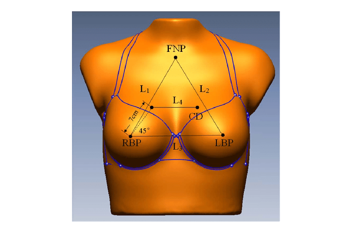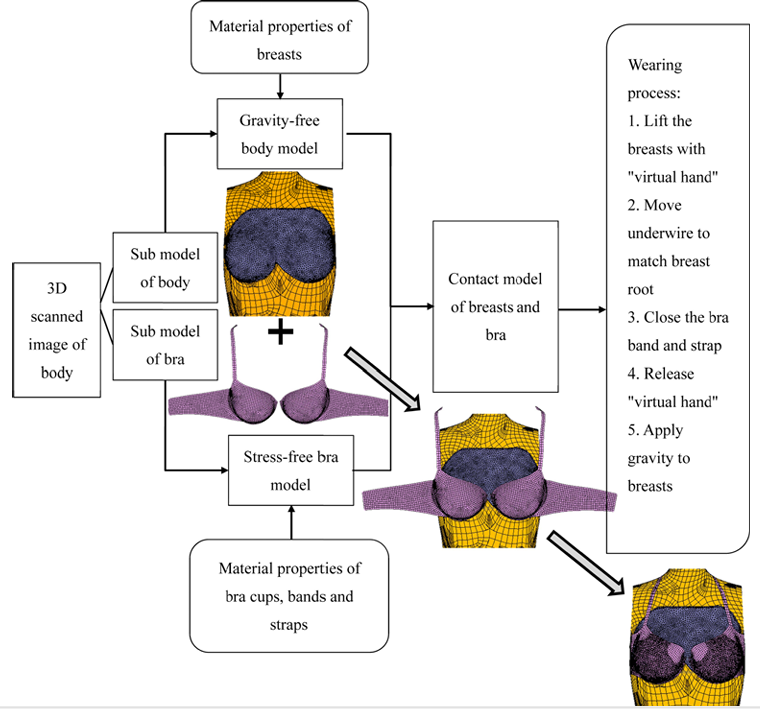 A well-fitting bra provides adequate and exceptional support of the breasts and the desirable body shape for the wearer but would not exert excessive pressure onto the breasts. Among the different design features of bras, the materials selected for the bra cups are a key element for enhancing breast support and improving the perceived comfort. This paper proposes a subject-specific model based on numerical simulation to investigate the influence of different types of bra cup materials on the shape of the breasts and amount of pressure on the breasts. The study comprises three phases. The first phase is the development of a subject-specific contact model and simulation of the bra-wearing process. The second phase is the construction and analysis of three models with different bra cup materials (knitted, woven and foam) to compare their shaping effects on the breasts and the corresponding amount of applied contact pressure. The third phase uses the validated numerical model to simulate the use of a series of virtual bra cup materials, their impact on the shape of the breasts, and the associated bra pressure. It is found that a stiffer fabric has a better performance in reshaping the breasts and reducing the amount of pressure from the straps onto the neck for a halter-neck bra but distributes a higher amount of pressure at the bottom part of the breasts. An overall better performance of reshaping the breasts is achieved by increasing the tensile strength of the bra cup material. Nevertheless, the small change in the shaping effects can be negligible after the Young’s modulus reaches about 1.5 MPa. Among the four measured variables, it is more useful to measure the gathering of the breasts and depth of cleavage than the lifting of the breasts to determine the amount of breast deformation caused by a bra. The newly developed finite element model for contact analysis in this study provides a better understanding on the interactive process between the breasts and the bra by predicting the deformation within a variance of 6.8 % in comparison to the experimental results of the contact pressure with the same trend and magnitude. Numerical simulations can therefore facilitate decisions on the type of fabric used for bra designs that provide optimal fabric pressure and other stretchable apparel products that take both the shaping effect and wear comfort into consideration.