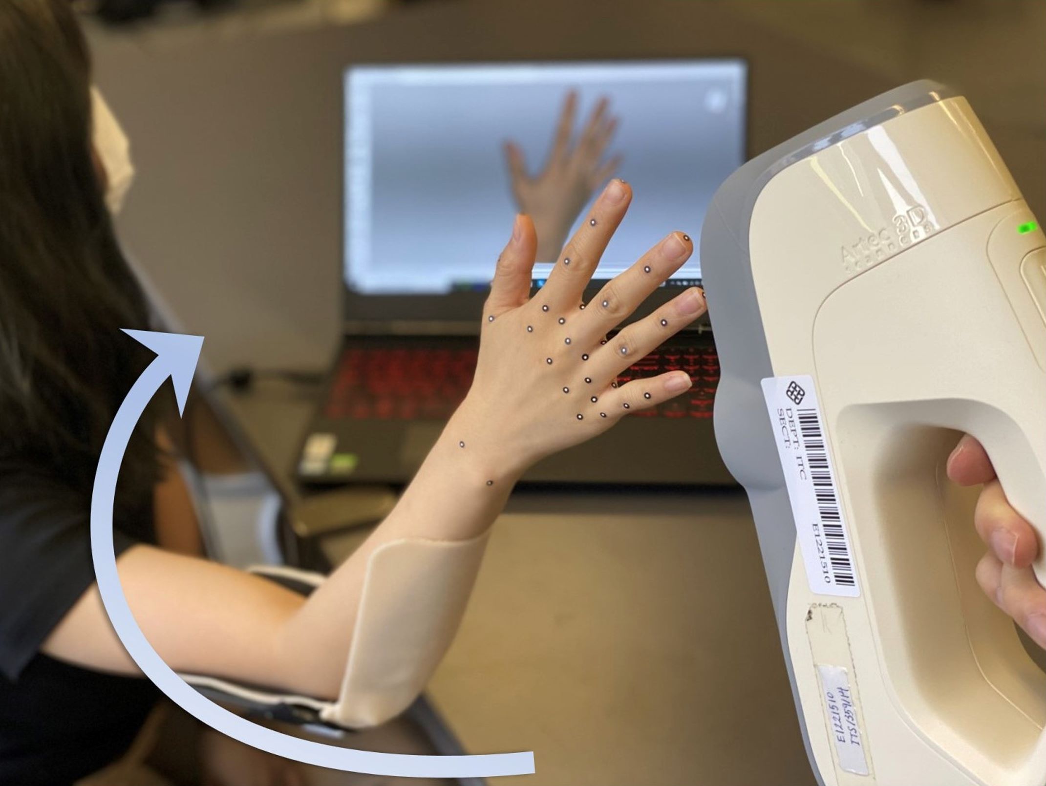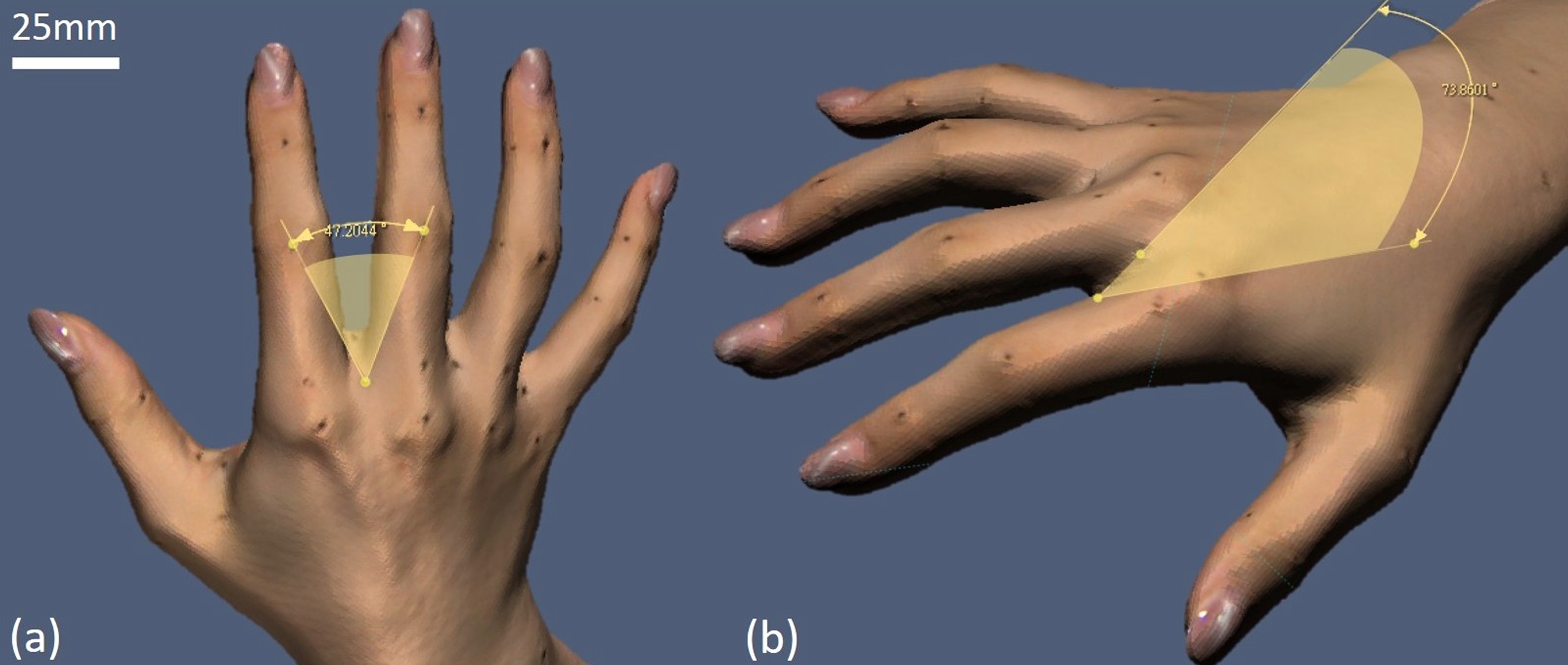 In this article, the impact of postural variations on hand anthropometry and distribution of skin strain ratios has been investigated. The literature suggests the glove fit directly affects hand functions. However, gloves currently manufactured based on a static posture failed to provide optimum fit. Workers often do not wear protective gloves due to discomfort caused by improper design, which increases the risk of hand injury. Full-color three-dimensional scans of the hands are captured with thirty healthy subjects (20 females, 10 males) to analyze the hand measurements and skin deformation with various postures. 42 of the 57 hand dimensions were found to have significant differences (p >0.05) related to hand posture. The skin strain ratios further suggest that the slant of the web space, dorsal-length and surface area should be increased, while the angles of the web space and length of the palm reduced to advance glove patterns. This research contributes to constructing gloves with optimum fit, performance, and comfort. Results show that in consideration of hand postures, the angle of the slant of web space between digits 2 and 5 and the finger length on the dorsal side should be increased, whilst the finger length on the palm side should be reduced in glove pattern design. Gloves currently constructed based on a splayed posture cannot provide a good fit. Consideration should be given to hand measurements in dynamic postures.