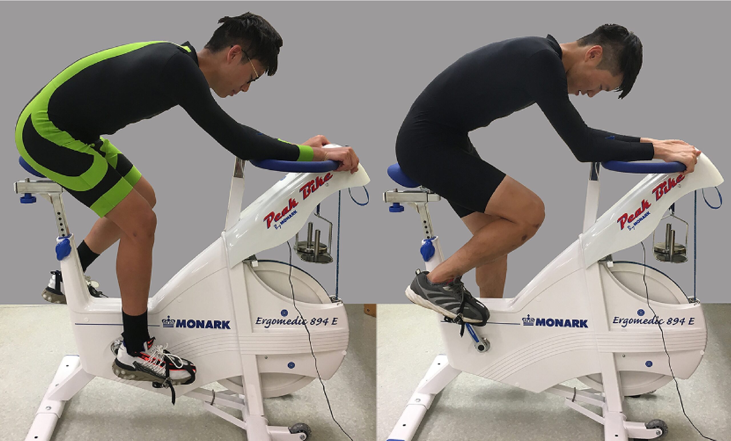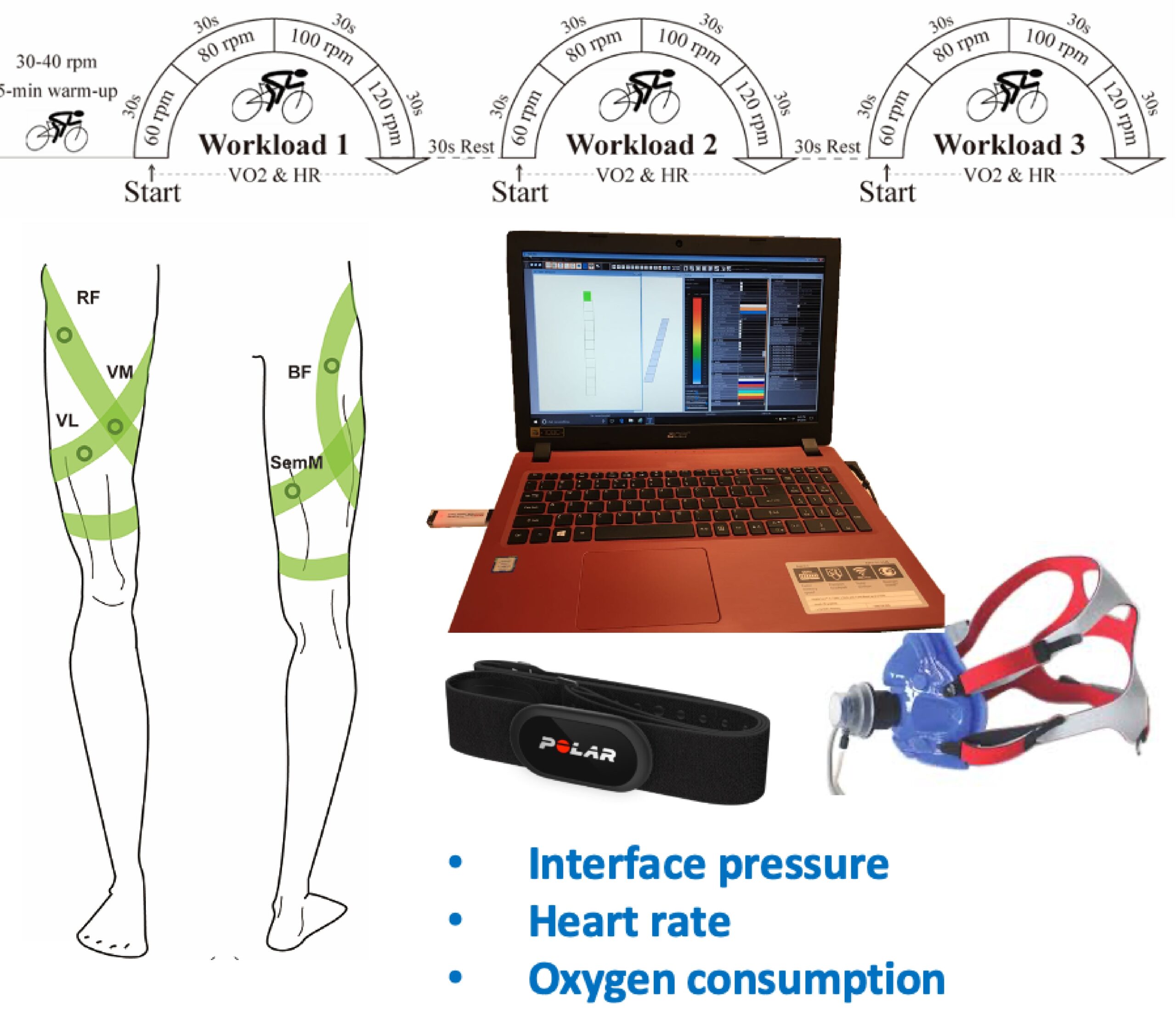 Energy consumption differences of two cycling garments during short-term cycling were studied. Eleven amateur male cyclists participated in two cycling sessions over two days while wearing a newly designed compression cycling skinsuit (CCS) with stripes simulating kinesio tape, and a conventional compression garment (CG) (control garment). In each session, the participants performed a set of 12 short-term cycling combinations of three workloads and four cadences with either the CCS or the CG. Each combination lasted for 30 s. Garment pressure values at the thigh, oxygen consumption (VO2) and heart rate (HR) were collected and analyzed.