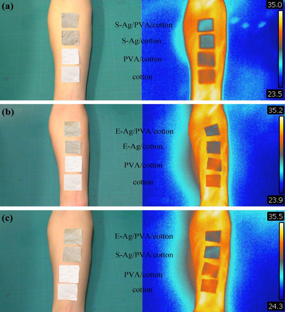 Multifunctional woven cotton fabric was successfully fabricated. The difference of coating methods and effect of pretreatment with polyvinyl alcohol (PVA) on the properties of prepared functional fabrics are evaluated. The results reveal that Ag-coated cotton sample presents electro-conductivity after pretreated with PVA while there is a little decrease in the UV blocking property. Moreover, samples impregnated with PVA and coated by magnetron sputtering method show a lower resistivity of 4.85 × 10–6 Ω m, a better performance on IR shielding with a reflection rate above 30%, a higher electromagnetic interference shielding effectiveness (EMI SE) about − 10 dB compared with samples coated by thermal evaporation method; and the Ag-coated samples pretreated with PVA are all show an excellent antibacterial effect with an inhibition rate over 95%. The excellent properties of samples fabricated by different method provide a new functional fabric for the smart clothing and textile industrial.