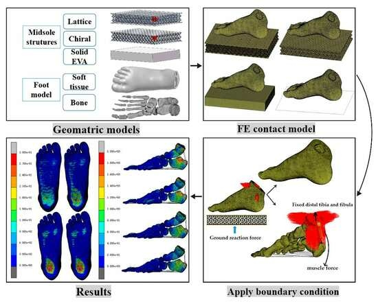 The foot, as the foundation of the human body, bears the vast majority of the body’s weight. Obese children bear more weight than healthy children in the process of walking and running. This study compared three footwear midsole structures (solid, lattice, and chiral) based on plantar pressure distribution and bone stress in obese and healthy children through numerical simulation. The preparation for the study included obtaining a thin-slice CT scan of a healthy 9-year-old boy’s right foot, and this study distinguished between a healthy and an obese child by applying external loadings of 25 kg and 50 kg in the finite element models. The simulation results showed that the plantar pressure was mainly concentrated in the forefoot and heel due to the distribution of gravity (first metatarsal, fourth metatarsal, and heel bone, corresponding to plantar regions M1, M4, and HM and HL) on the foot in normal standing. Compared with the lattice and solid EVA structures, in both healthy and obese children, the percentage reduction in plantar pressure due to the chiral structure in the areas M1, M4, HM, and HL was the largest with values of 38.69%, 34.25%, 64.24%, and 54.03% for an obese child and 33.99%, 28.25%, 56.08%, and 56.96% for a healthy child. On the other hand, higher pressures (15.19 kPa for an obese child and 5.42 kPa for a healthy child) were observed in the MF area when using the chiral structure than when using the other two structures, which means that this structure can transfer an amount of pressure from the heel to the arch, resulting in a release in the pressure at the heel region and providing support at the arch. In addition, the study found that the chiral structure was not highly sensitive to the external application of body weight. This indicates that the chiral structure is more stable than the other two structures and is minimally affected by changes in external conditions. The findings in this research lay the groundwork for clinical prevention and intervention in foot disorders in obese children and provide new research ideas for shoe midsole manufacturers