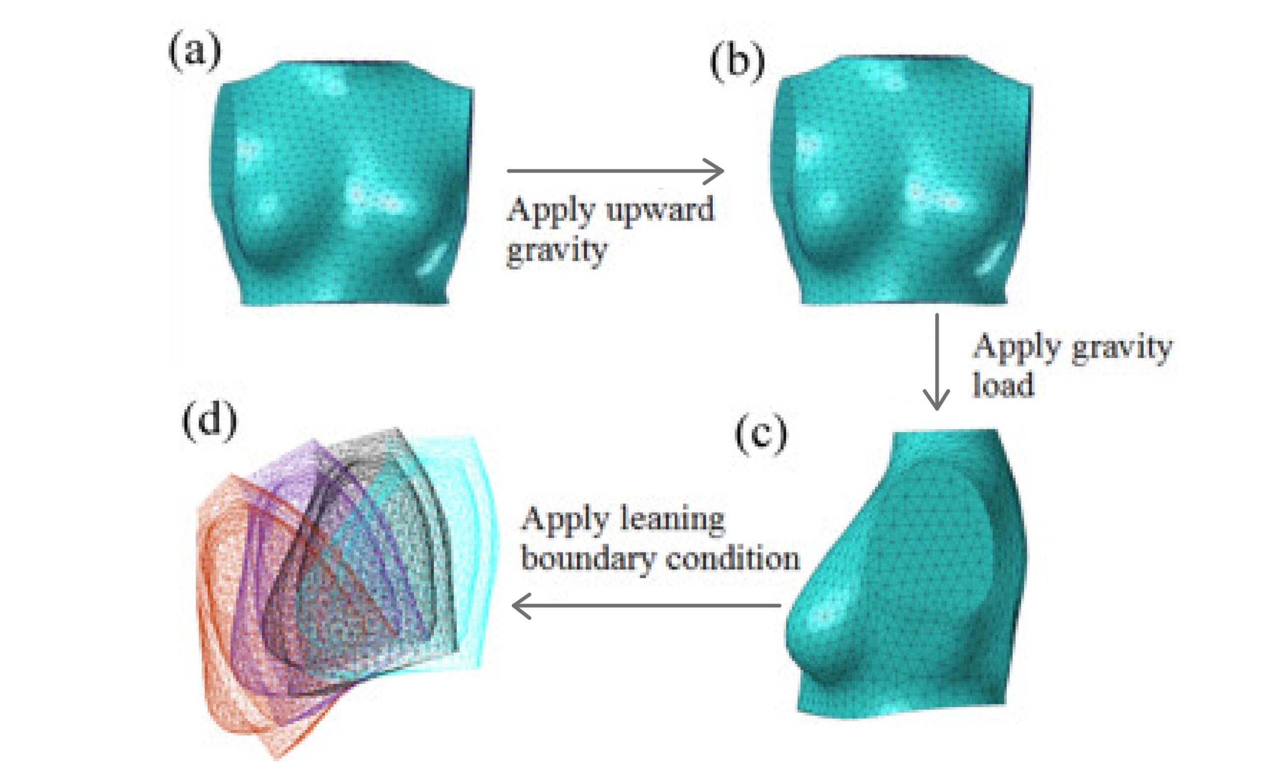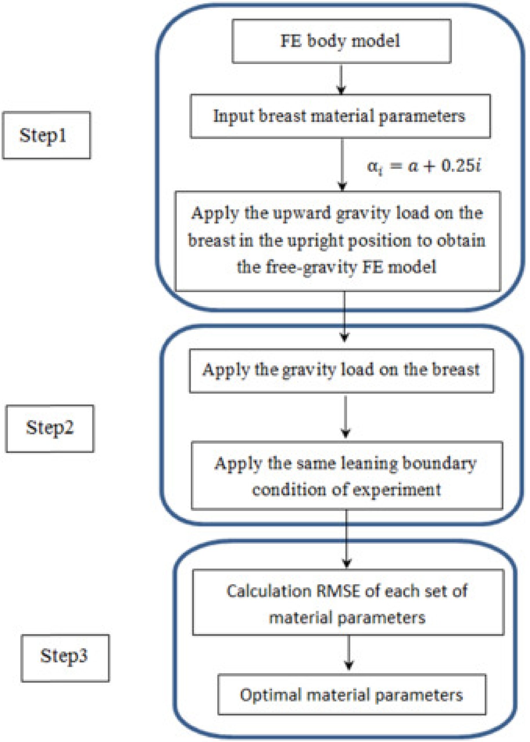 It has been a long-standing problem in the engineering design of bra for optimal support and shaping due to the difficulty of quantifying the hyper-elastic properties of human breasts. The objective of this study is to determine an optimal approach to obtain the non-linear properties of breast soft tissues and the corresponding deformations during motions. The Mooney-Rivlin material parameters of the breasts in-vivo were verified through an optimization process that involved iteratively changing the material coefficients with the integration of static and dynamic finite element models. Theoretical equations of a rigid-flexible coupled system during the motion of forward-leaning were established with gravitational, centrifugal and Coriolis forces to simulate the dynamic deformation of the flexible breasts. The resultant, optimally generated, coefficients of the Mooney-Rivlin hyperelastic material type for the breast were found. This new set of breast material coefficients was verified by finite element analysis of the breast deformation during forward-leaning and running movement. The method proposed in this study provides an effective way to determine the breast properties for predicting breast deformation and analysis of the bra-breast contact mechanism and thus, improving the design of bras.