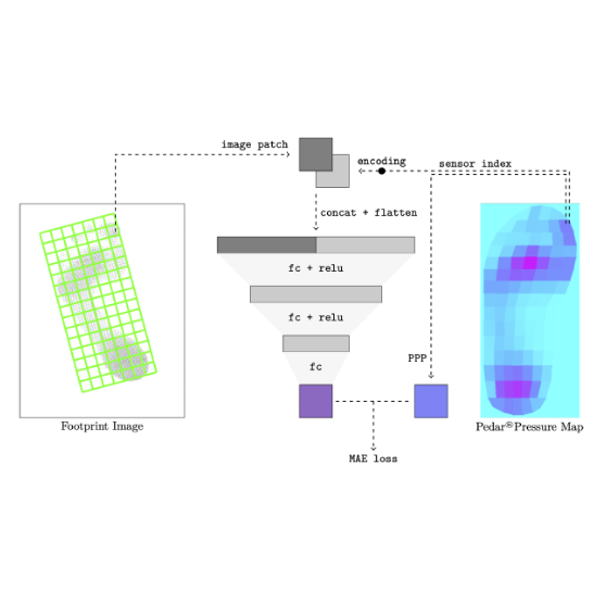 Assessing plantar pressure is crucial for fabricating diabetic insoles and preventing diabetic foot ulcers (DFUs), which are caused by increased plantar pressure. However, the commonly used methods for assessing plantar pressure distribution involve professional sensor-based equipment and expertise, which are costly and time-consuming. Given the qualitative association between ink footprint images and plantar pressure, this study proposes using the footprint images to predict the quantitative values of dynamic plantar pressure in barefoot and 4 different insole conditions (including Nora Lunalastik EVA, Nora Lunalight A fresh, Pe-Lite, and PORON Medical 4708) based on a multilayer perceptron (MLP) neural network model. To provide more precise insole material recommendations for specific foot regions for better plantar pressure distribution, the plantar of the foot is divided into 5 regions: the toes, metatarsal heads, medial midfoot, lateral midfoot, and heel. Patch-based MLP with localization embedding is introduced to learn the correspondence between ink density and plantar pressure information. Ground-truth data collected from 52 diabetes patients is constructed as a dataset named diabetes-footprint-to-pressure and used to train and validate the model. The mean absolute error (MAE) of the models for the barefoot and 4 insole conditions is 5.51% (33.06 kPa), 3.99% (23.94 kPa), 4.85% (29.10 kPa), 4.25% (25.50 kPa), and 3.57% (21.42 kPa) of the sensing range, respectively. Compared to traditional methods for plantar pressure assessment, this approach streamlines the process of acquiring the overall and regional dynamic plantar pressure with barefoot and 4 different insole materials. Clinicians can quickly provide recommendations on the type of insole material for individual patients.